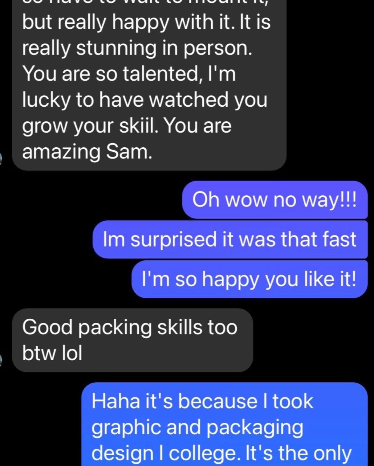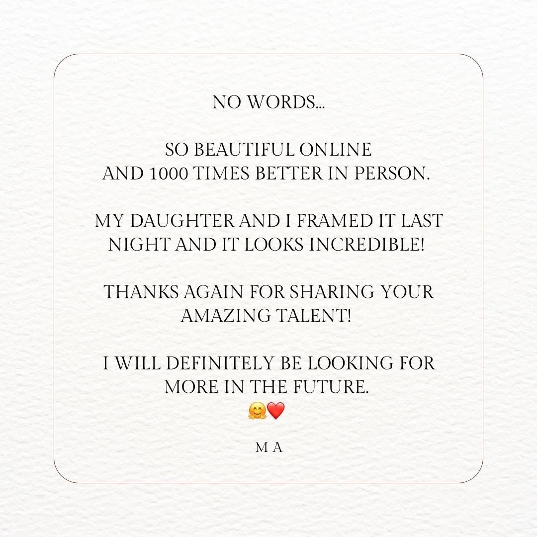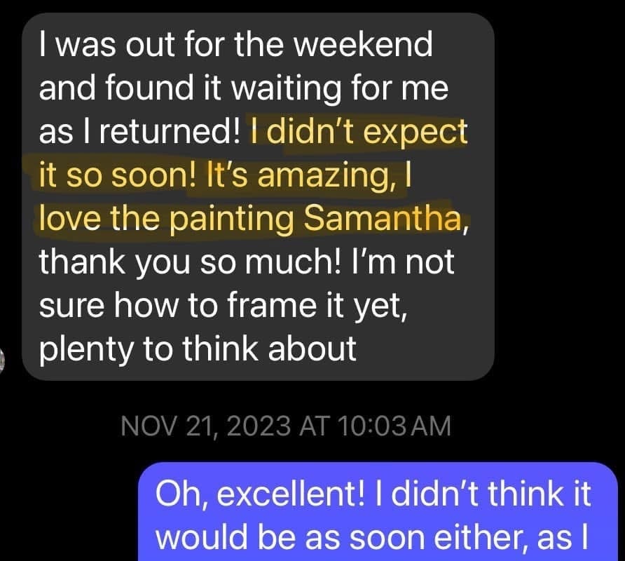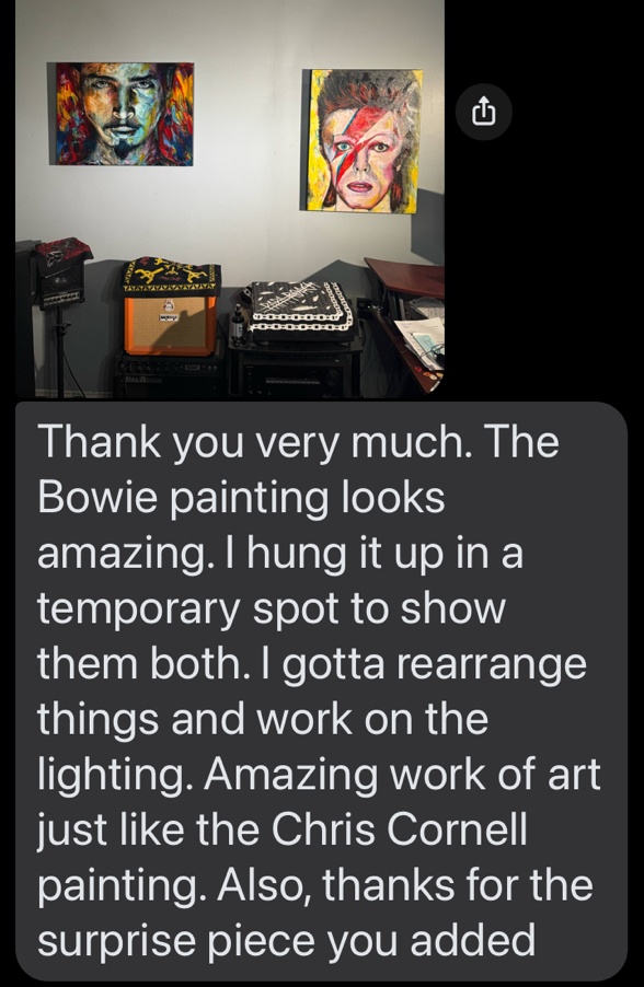 I ordered one of Samantha's canvas paintings and absolutely couldn't be happier with it. The uniqueness of the actual art, along with the amazing colors are unlike anything I've ever seen. Gord Downey is very... Tragically Hip in our house.